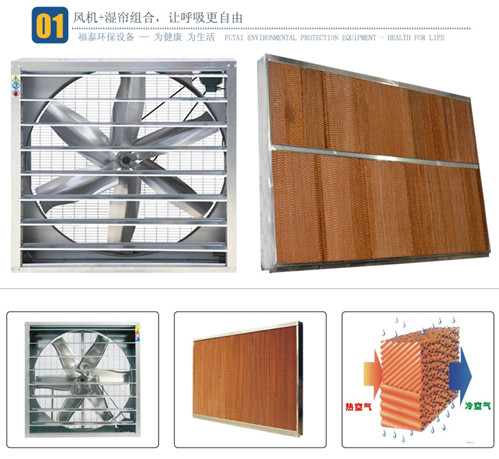 濕簾裝在密閉房舍一端山墻或側墻上,風機裝在另一端山墻或側墻上,降溫風機抽出室內空氣,產生負壓迫使室外的空氣流經多孔濕潤濕簾表面時,使空氣中大量熱量進行轉化處理從而迫使進入室內的空氣降低10-15℃,并不斷的引入室內進行防暑降溫。