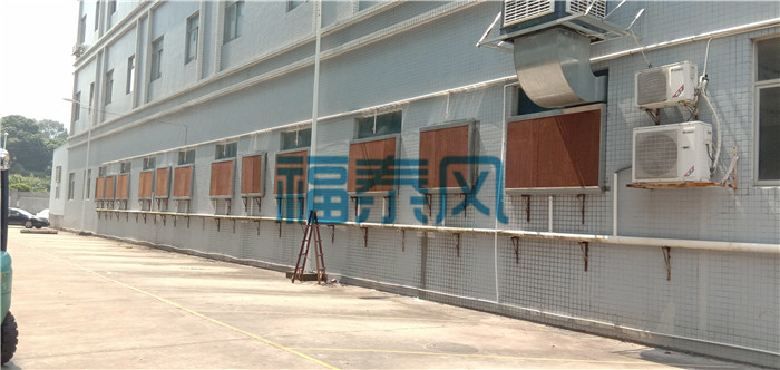 廠房外墻上安裝環保空調,它是通過風機往廠房內送風,室外的新鮮空氣流經浸水的濕簾后空氣與水份充分接觸同時吸收空氣重點中的顯熱,從而達到降溫、換氣、除塵、增加車間內空氣含氧量的目的,這個方案特別適用于高溫及人群密集場所
