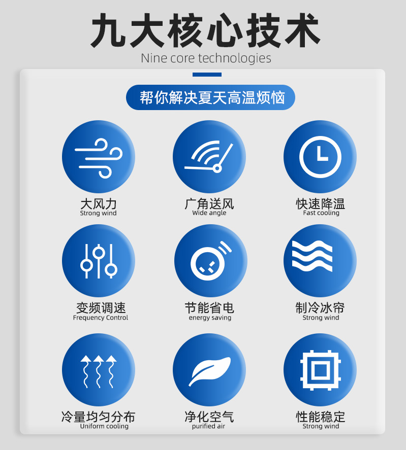 .節(jié)能省電、同等面積安裝比傳統(tǒng)空調(diào)省電30~50%,覆蓋面積大一臺5P的可以覆蓋200個平方車間降溫,出風(fēng)口溫度可以做到13-16度。車間溫度可做到20-26度適合人體體感溫度。