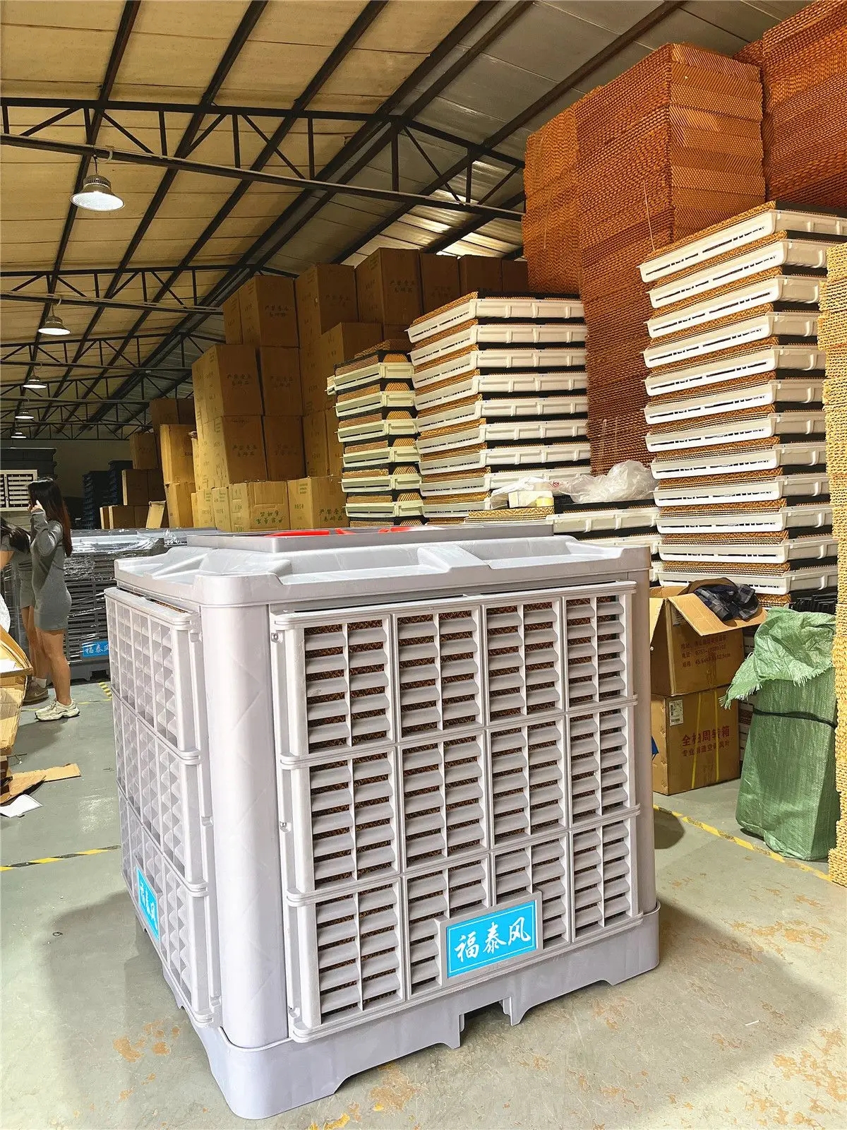 全自動電子控制及自動清洗功能,采用100MM厚“多層波紋纖維疊合物濕簾”,降溫能力特強,采用八葉輪機翼前掠曲葉片,噪音低,效率高。